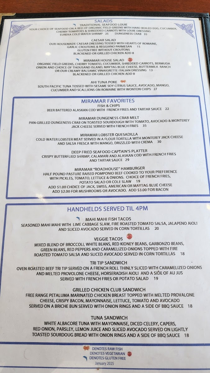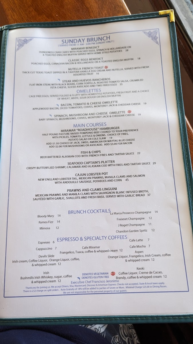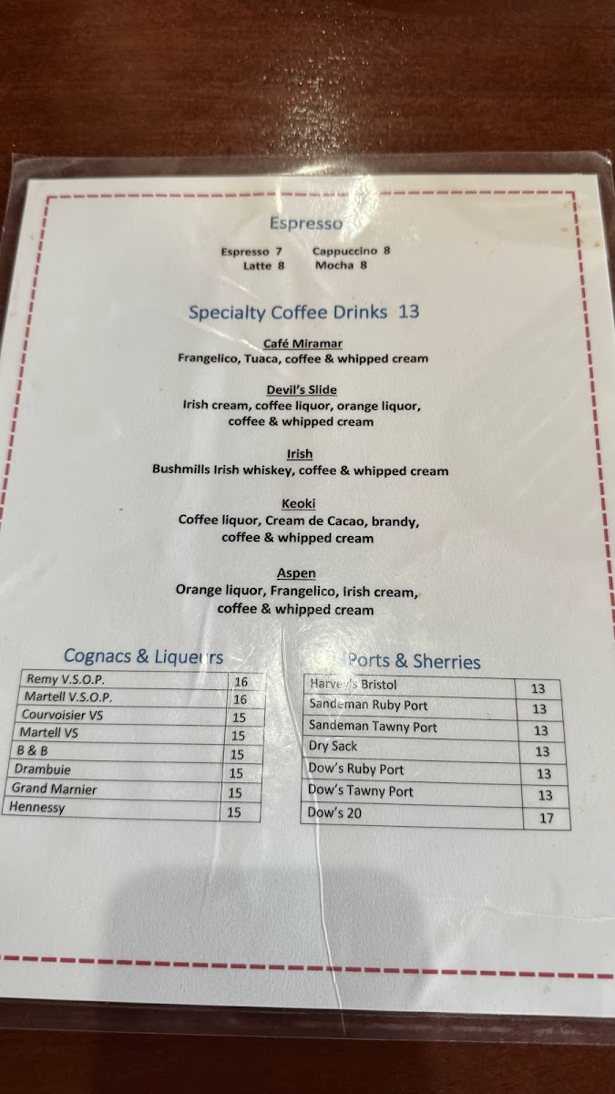 Beverages encompass a range of cocktails including the Miramar Mai Tai and virgin piña coladas, alongside coffee options such as Irish coffee. These drinks are suitable for both casual meals and social occasions.