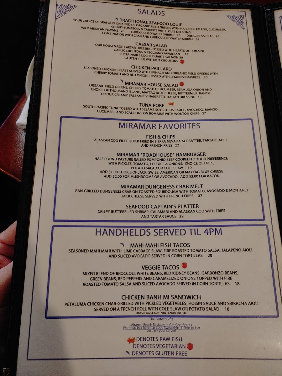 The menu at Miramar Beach Restaurant offers a diverse selection of American-style dishes with a strong focus on seafood. It is organized into several groups that cater to different dining preferences, including starters, soups, salads, main courses, desserts, and beverages.