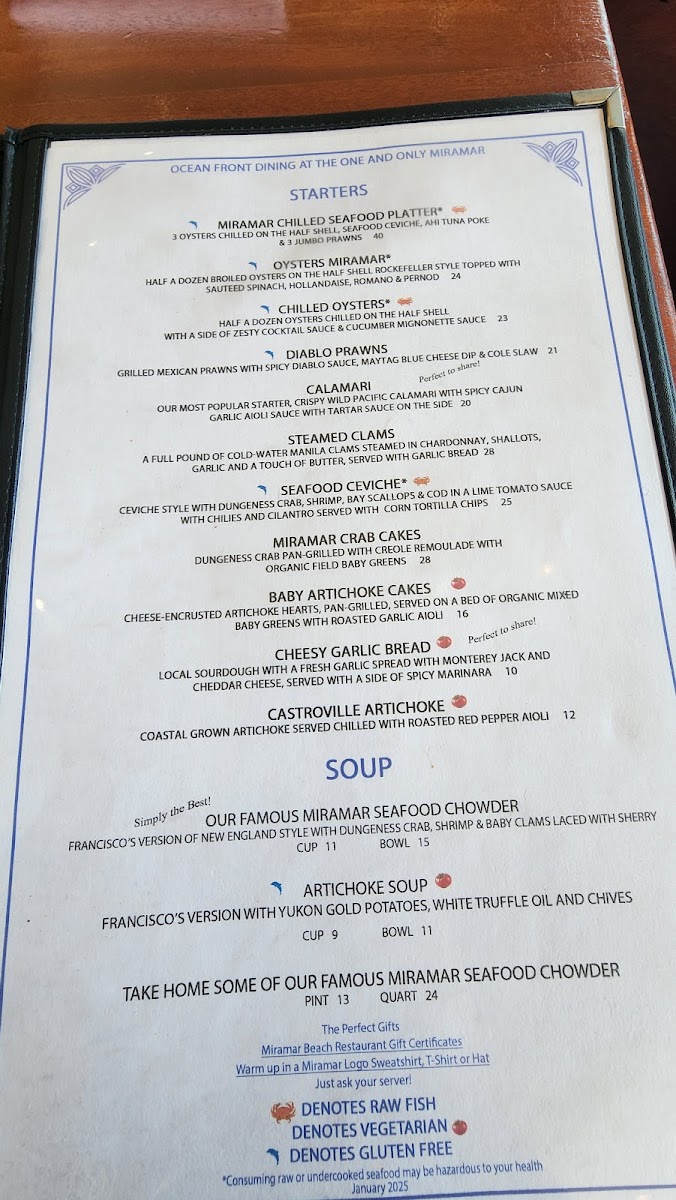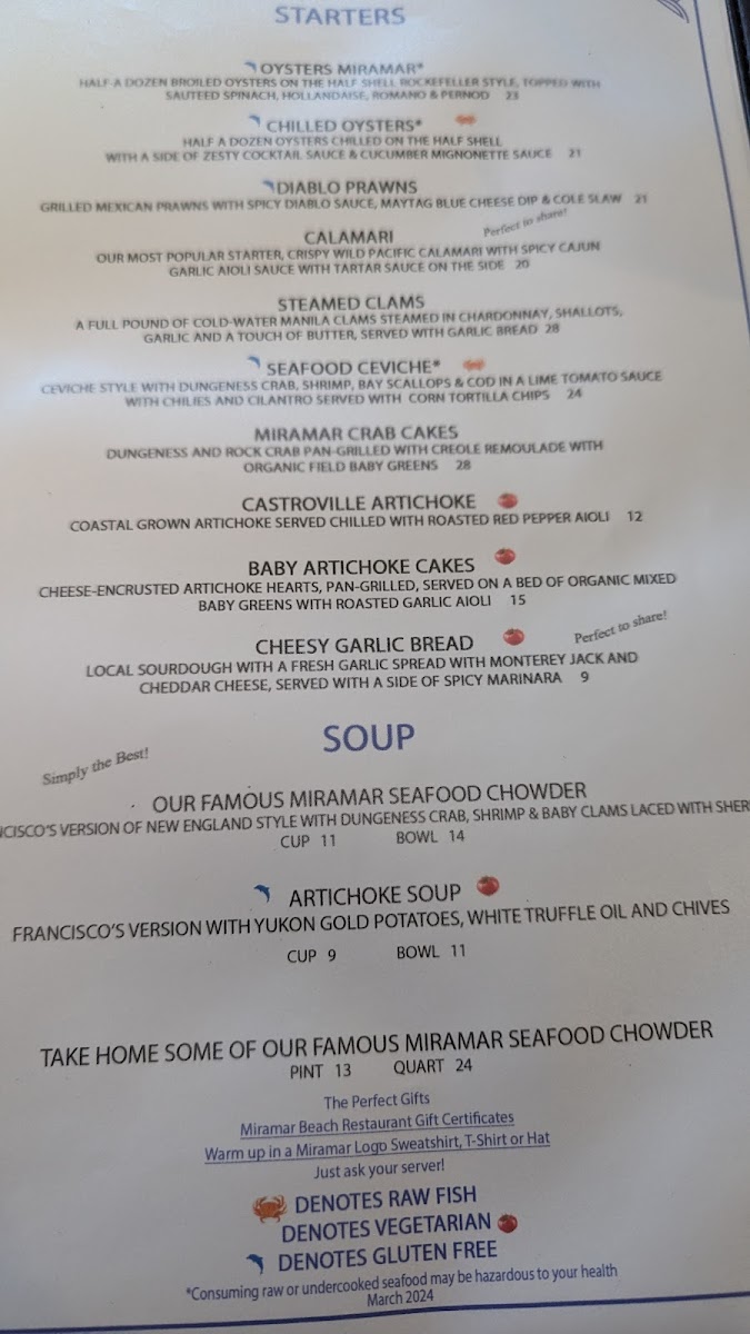 Soups include signature items like the Miramar Seafood Chowder, prepared New England style with shellfish, and an artichoke soup with Yukon gold potatoes and white truffle oil. Soups can be enjoyed as a starter or a light option on the menu.