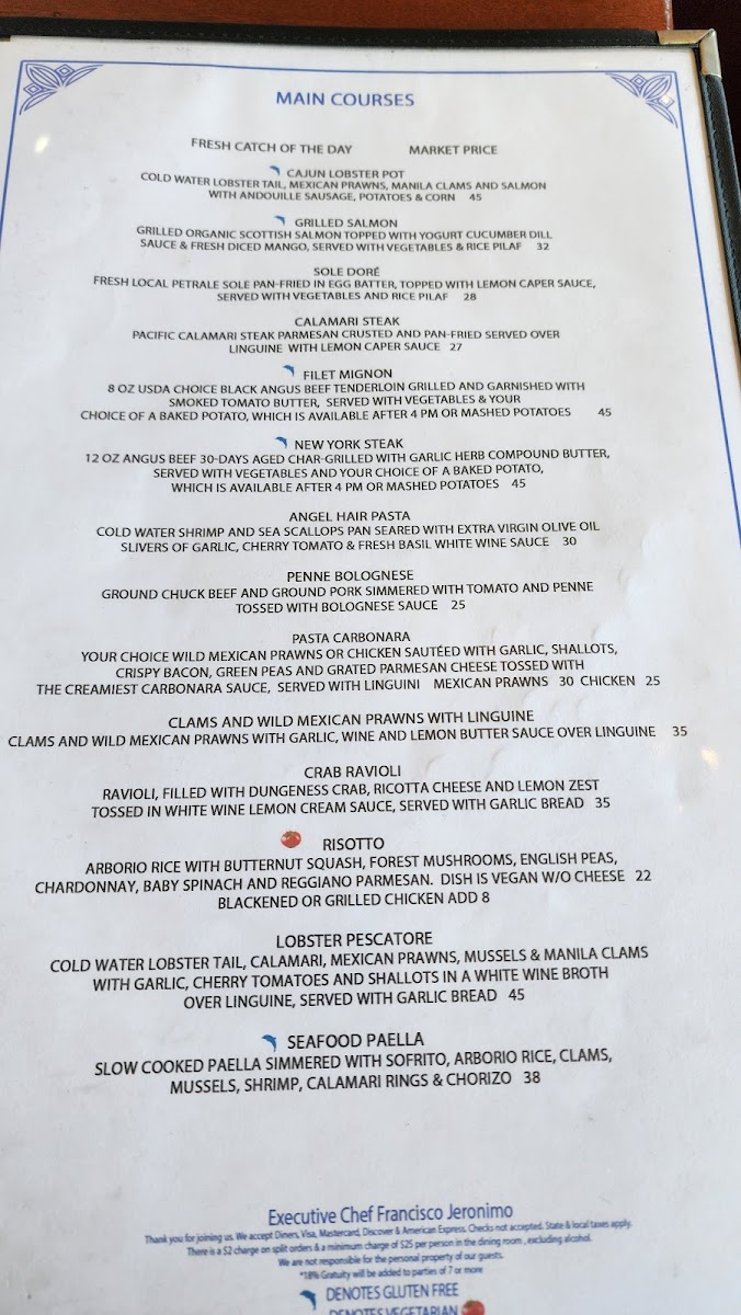 Main courses focus heavily on seafood, including dishes like seafood paella, mahi mahi fish tacos, Alaskan cod fish and chips, seafood cioppino, and various preparations of fresh oysters and crab. There are also non-seafood options such as a New York steak.